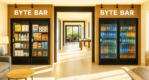 Byte Bar is a self-serve, AI-powered mini-market system for apartment buildings, large offices, and short-term rentals—ranging from a single smart cooler/freezer to a full open-shelf market with multiple coolers and freezers. Guests tap to enter, shop naturally, and walk out; our AI (cameras + shelf-weight sensors) recognizes items and charges automatically. We install, stock, and maintain everything—no on-site staff or daily work required.